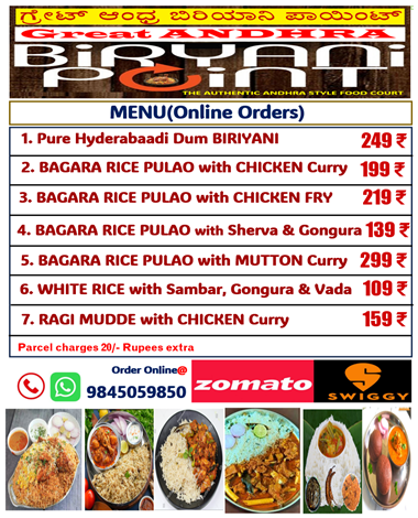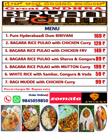 The story of Great ANDHRA Biryani Point(GABP) began with the idea of four software Engnieers working across Globe who are highly passionate about restaurant industry. Tracing this etymological history thread, it is widely believed that Biryani originated in Persia (or modern-day Iran) and was brought to India by the Mughals in the 16th century. GABP has a courage of conviction about the wonders of traditional Andhra cuisine. How could anyone anywhere resist the spicy aromas, the earthy flavours, the tantalizing tastes of coastal Andhra/Telangana? It took time. The strong Andhra flavours were alien to the Bangalorean palate. But once discovered, they were converted for life. Biryani is widely replaced by our traditional food Specialized Bagara Rice with Chicken curry and Gongura.